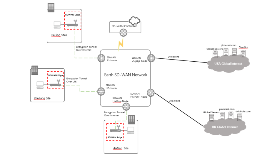 | Usage effect | Each branch site of the user connects to the company's backbone network via the Internet and gets access to the overseas Internet through the company's global backbone network. Our SD-WAN Edge will intelligently accelerate the customer's access to various major application services overseas |