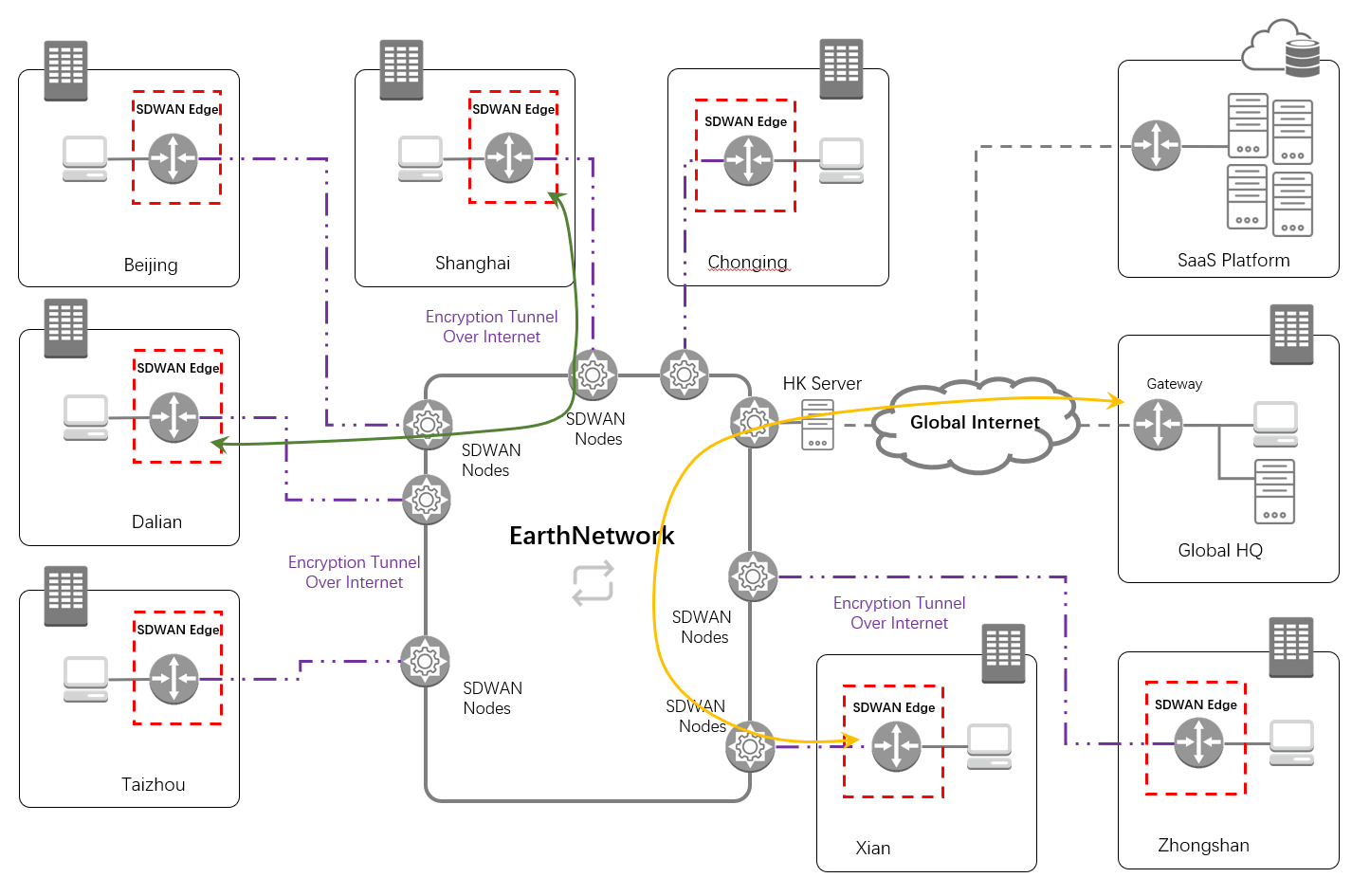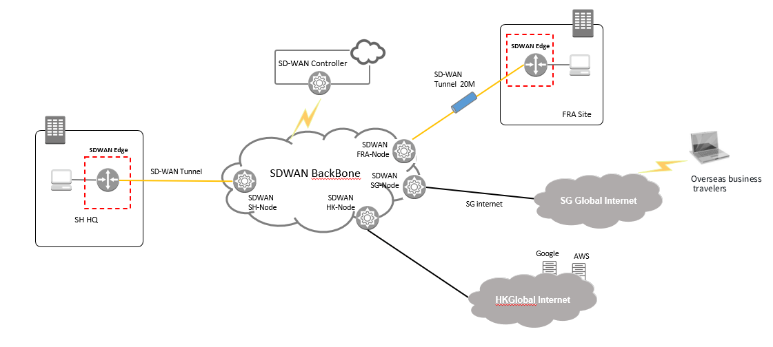 | Usage effect | Each branch site of the user connects to the company's backbone network via the Internet and accomplishes overseas business access and production data synchronization through the company's backbone. The latency has been optimized by 40ms compared with the previous MPLS dedicated line |