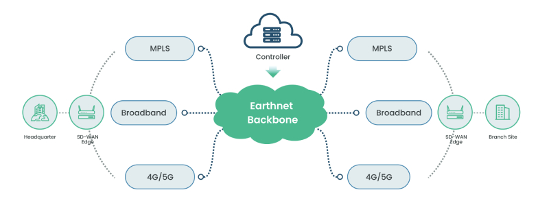 The SD-Branch networking model refers to a network service where each site connects to the EarthNet Backbone via leased lines, the Internet, the LTE, and other means, with data transmission occurring through the EarthNet Backbone.